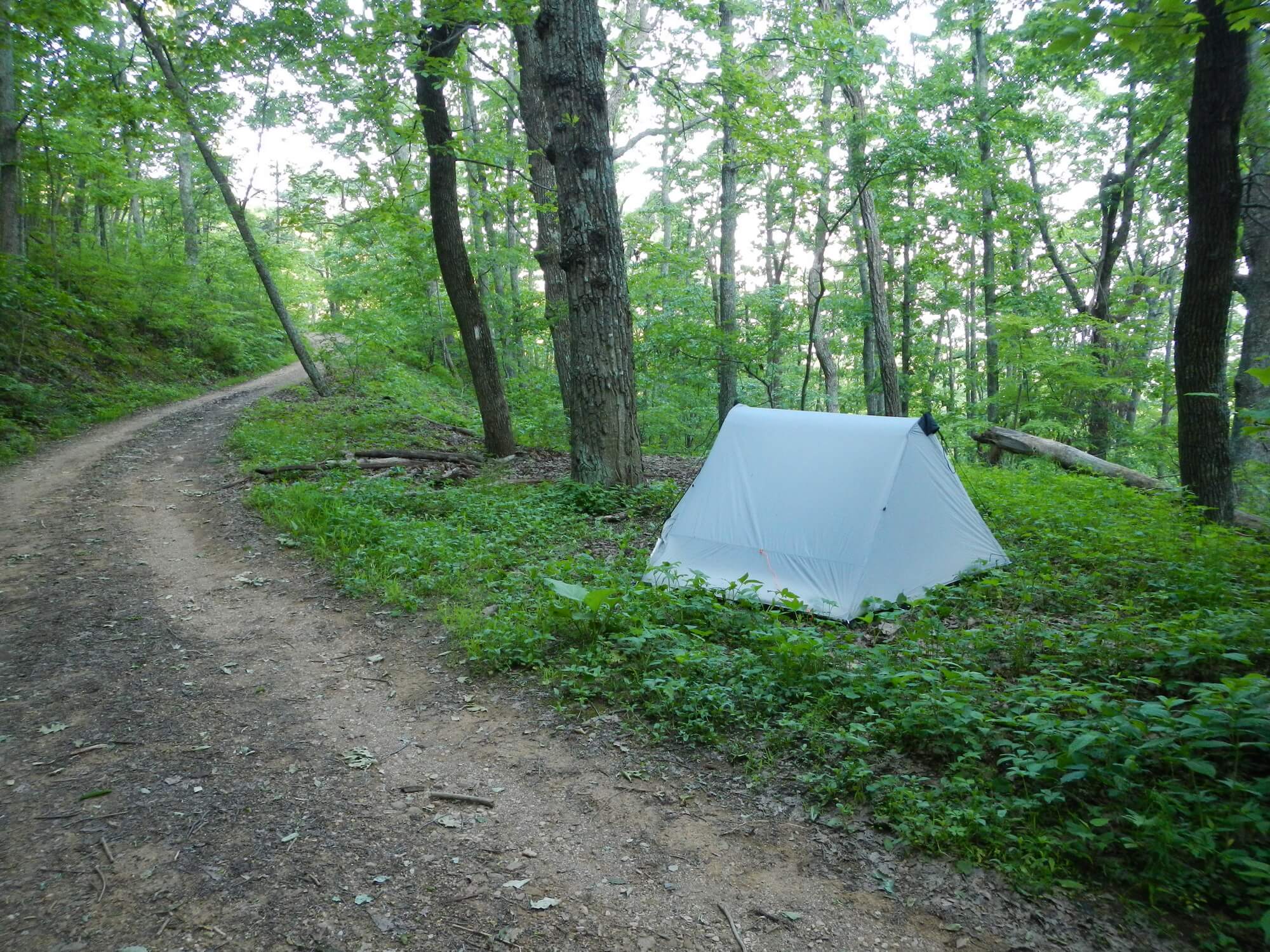 Continental Breakfast von 5 bis 9 Uhr? …. Naja, wir vertragen ja mittlerweile viel, aber Schlaf ist auch nicht zu verachten und von 7 bis 9 Uhr passen auch noch viele Waffeln, Müsli und Bagels in einen rein. Und da auf den nächsten 9 Meilen kein brauchbares Wasser zu finden sein sollte, ließen wir uns an der Tanke, in der Sonne sitzend, nochmal mit Cola volllaufen. Dadurch brachen wir mal wieder erst um 10 Uhr zu den geplanten 19 Meilen auf. Das Höhenprofil versprach keine bösen Überraschungen und bei diesem schönen Wetter machten wir etliche Pausen…. Der Zeichner des Höhenprofils hatte natürlich mal wieder einige nicht unerhebliche Erhebungen vergessen zu erwähnen und durch die vielen schönen Pausen wurde es mal wieder dämmrig, bis wir ankamen. Das Shelter war schon voll und die wenigen, irgendwie brauchbaren Zeltplätze auch schon belegt (und wir sind schon lange nicht mehr anspruchsvoll!). So holten wir nur Wasser, wobei wir eine Wasserschlange aufschreckten – oder sie uns? – und liefen mal wieder im Dunkeln weiter, bis sich am Wegesrand ein flaches Plätzchen fand.